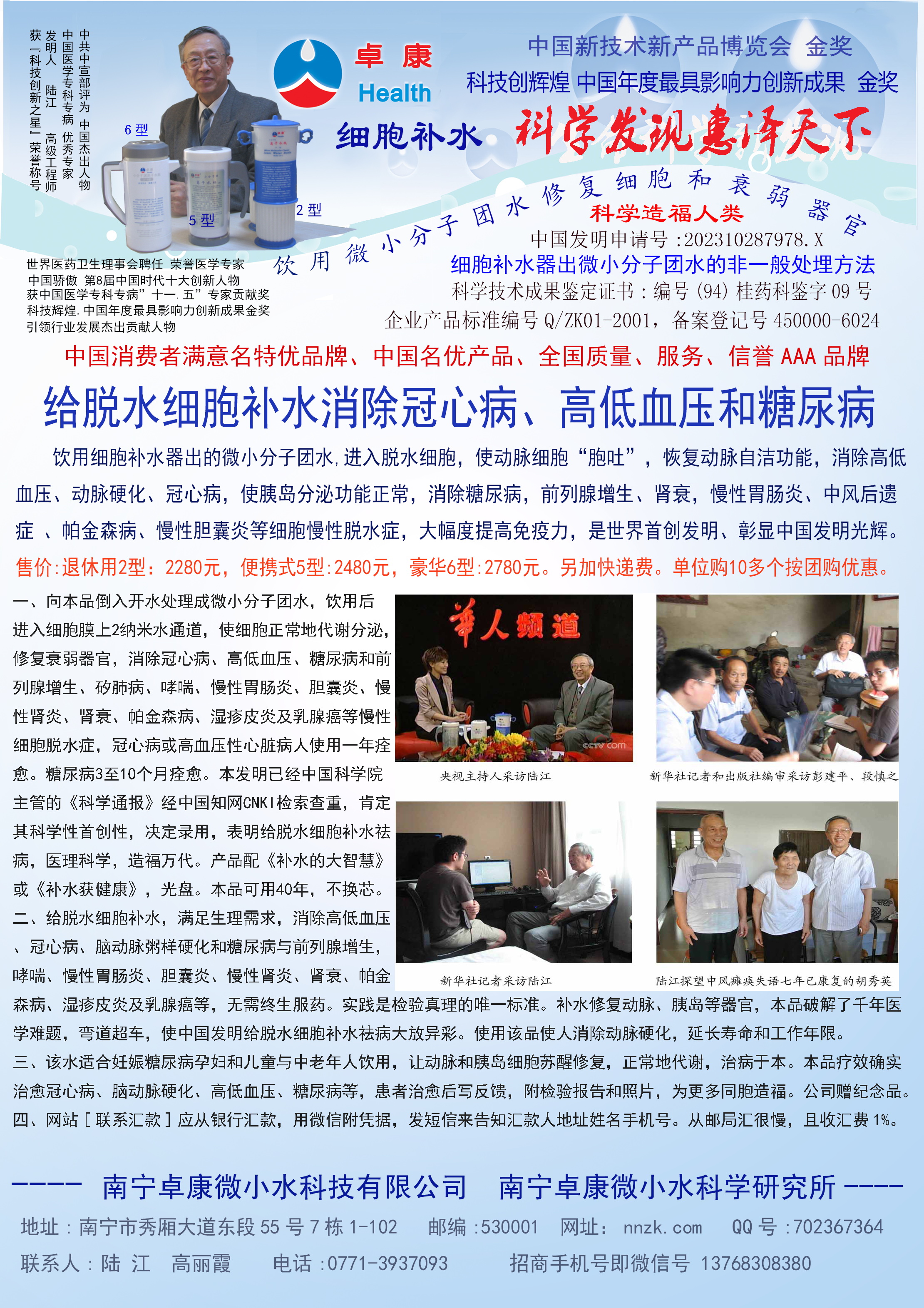 人類幾千年來患以上病癥需終生服藥,幾十年也不能治愈。可是我國南寧的高級工程師陸 江,于1990年想根治高血壓,研究發(fā)明了離子水瓶,處理出微小分子團(tuán)水供飲用,經(jīng)過醫(yī)院臨床試用和專家鑒定,1999年獲中國發(fā)明專利權(quán),產(chǎn)品于2000年投放市場后一直跟蹤調(diào)查,據(jù)全國各地用戶反饋:祛除了高低血壓、糖尿病和冠心病,并使前列腺增生、咽喉炎、鼻竇炎、慢性氣管炎、支氣管炎、矽肺病、哮喘、慢性胃炎、腸炎、慢性膽囊炎、慢性腎炎、腎衰、膀胱炎、便秘、痔瘡、風(fēng)濕性關(guān)節(jié)炎和濕疹皮炎及中風(fēng)后遺癥等病癥不藥而愈。為什么喝微小水能治20多種病?陸 江從1991年德國科學(xué)家發(fā)現(xiàn)細(xì)胞膜水通道僅為2納米獲得啟發(fā),認(rèn)為多種器官患病是因細(xì)胞脫水,不能正常代謝和分裂增殖,才使器官細(xì)胞減少致衰弱萎縮而形成細(xì)胞缺水性病癥。22年來的實(shí)踐有力地支持了“細(xì)胞脫水致病”這一重要論點(diǎn),表明喝微小水可滿足細(xì)胞的生理需求,補(bǔ)水就能祛病,是生命科學(xué)新亮點(diǎn)。